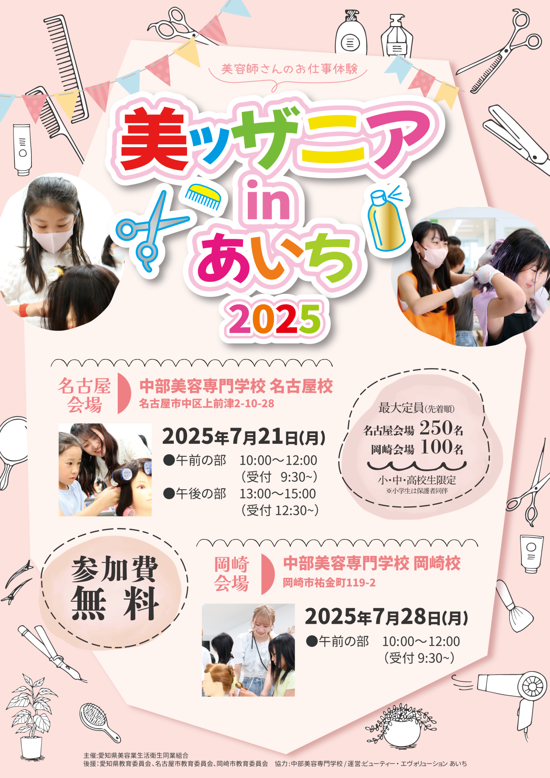 昨年、中部美容専門学校名古屋校・岡崎校で開催し好評だった小・中学生、高校生向けの美容師体験イベント「美ッザニア in あいち」を今年も開催することになりました。