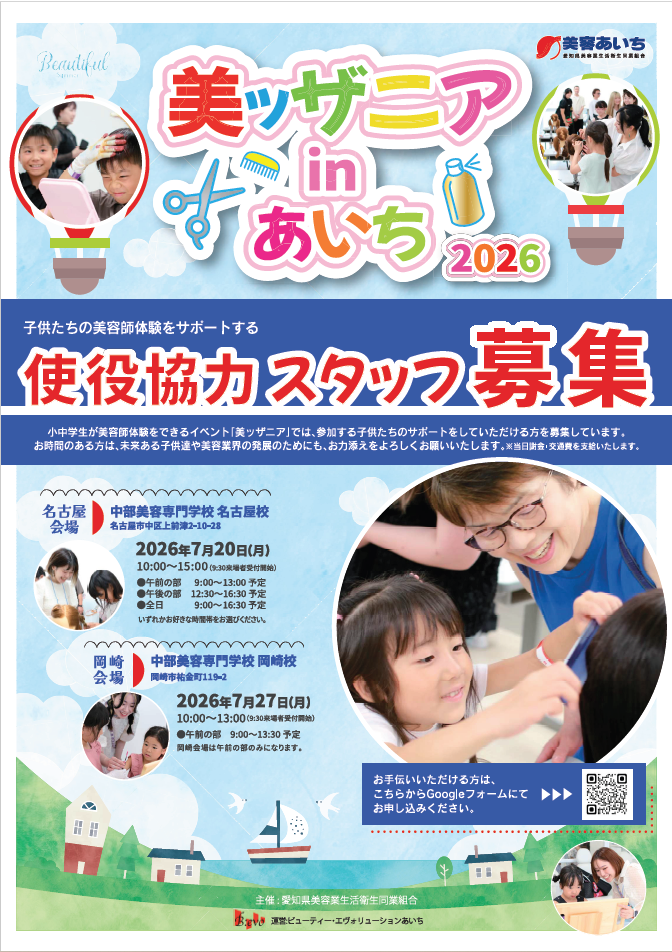 昨年、中部美容専門学校名古屋校・岡崎校で開催し好評だった小・中学生向けの美容師体験イベント「美ッザニア in あいち」を今年も開催することになりました!